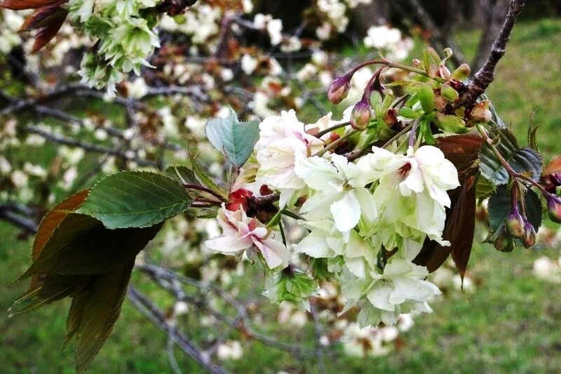 花びらが 最初貴族の衣装の萌黄色 淡黄白色 そしてピンクへ変わっていく不思議な桜とあります