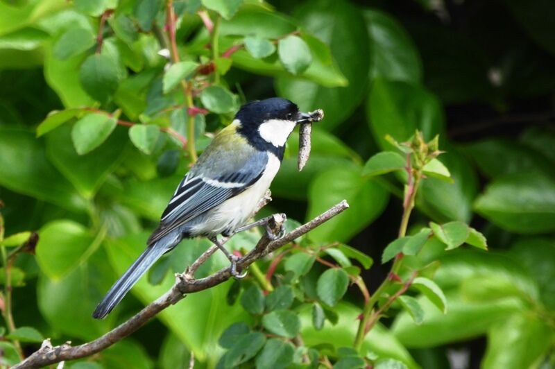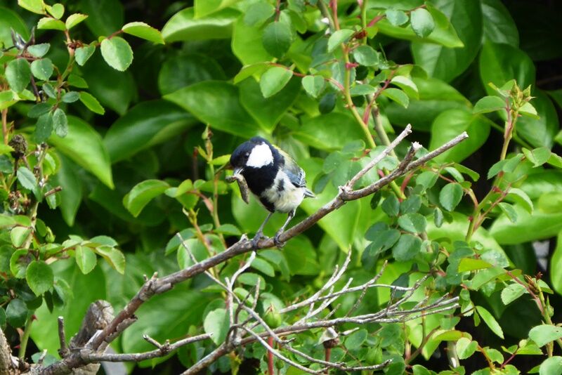 古いほうの巣箱では シジュウカラが ただいま子育ての真っ最中で お母さんかお父さんか 虫をくわえて 運んでいます 時々鳴き交わす声がいいですね