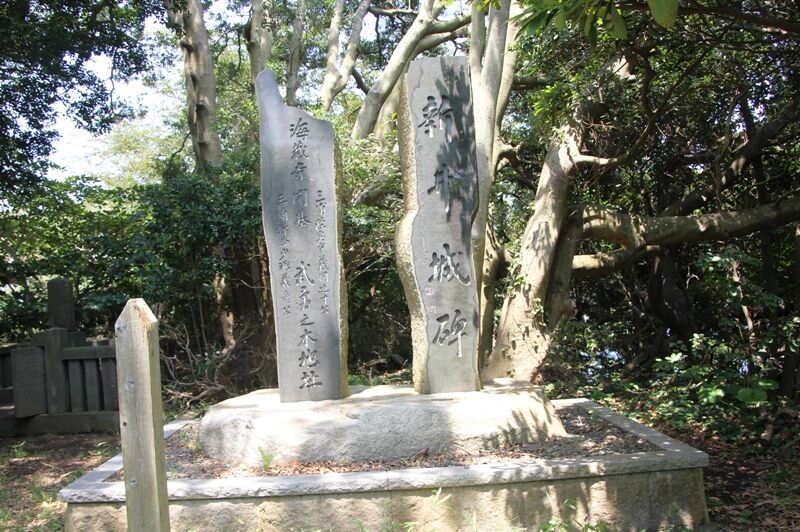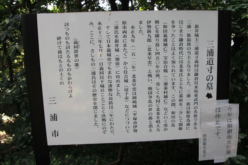 新井城は今の油壺マリンパークの場所にあったそうで 城址といっても石碑がひっそり隅にあり三浦道寸義同のお墓があるだけ 当時をほうふつさせるものは何もない